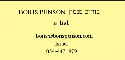 In 1991 Boris moved with his wife and two sons into an agriculture settlement in the center of Israel (which suited his artistic life), and built a studio where he draws, paints, and teaches the arts.